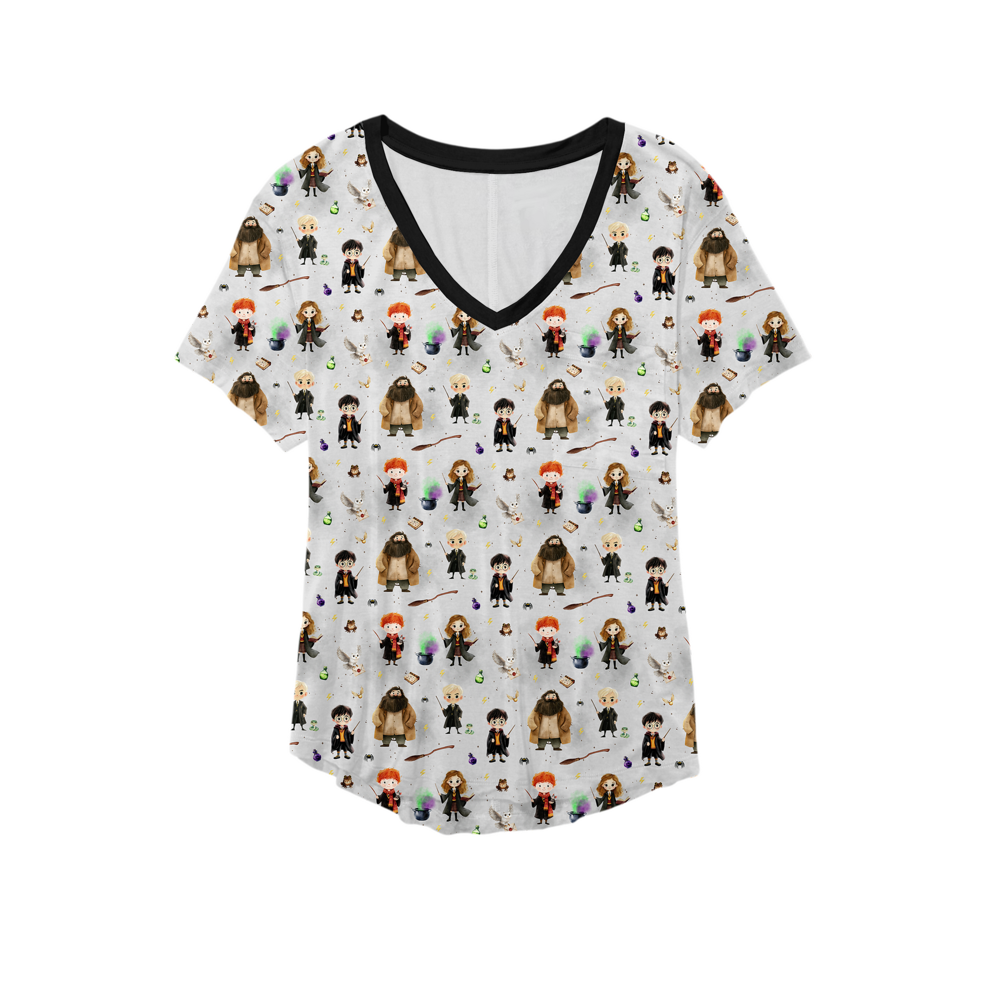 Featuring an enchanting all-over print of wizarding friends, potions 🧪, spells, and magical details, this tee brings whimsical charm and storybook magic to your lounging moments.